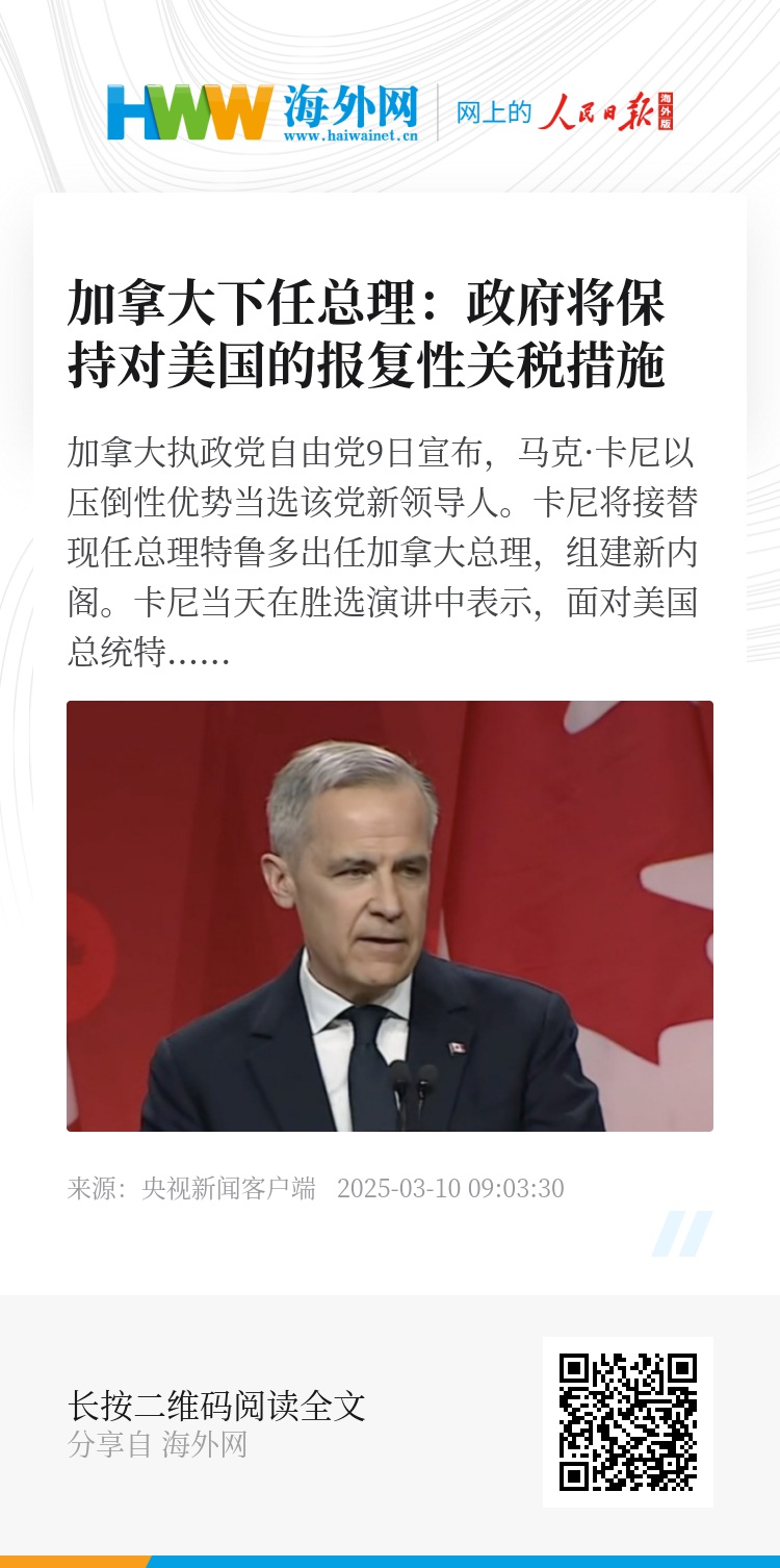 加拿大执政党自由党9日宣布,马克·卡尼以压倒性优势当选该党新领导人。卡尼将接替现任总理特鲁多出任加拿大总理,组建新内阁。卡尼当天在胜选演讲中表示,面对美国总统特朗普的威胁和一个更加分裂和危险的世界,人们担心加拿大的未来。