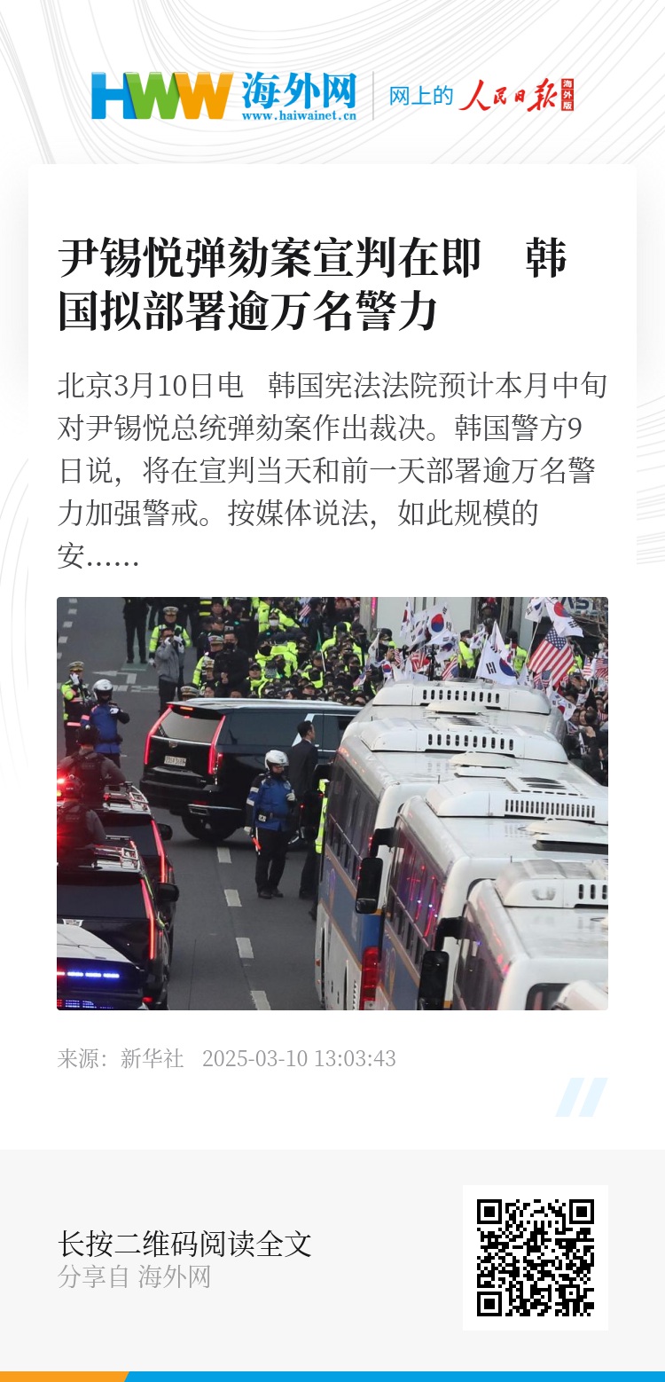 新华社北京3月10日电 韩国宪法法院预计本月中旬对尹锡悦总统弹劾案作出裁决。韩国警方9日说,将在宣判当天和前一天部署逾万名警力加强警戒。按媒体说法,如此规模的安保措施在韩国“前所未有”。