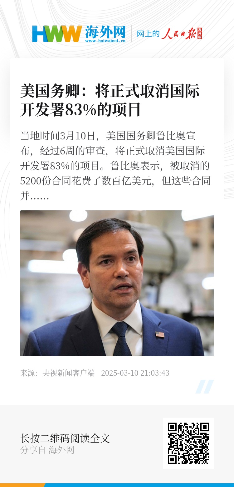 当地时间3月10日,美国国务卿鲁比奥宣布,经过6周的审查,将正式取消美国国际开发署83%的项目。