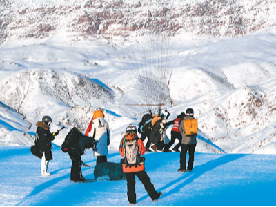 游客在将军山国际滑雪度假区体验滑翔伞。