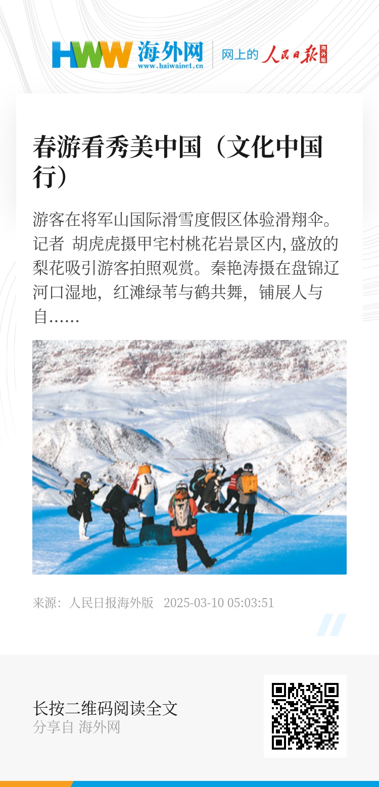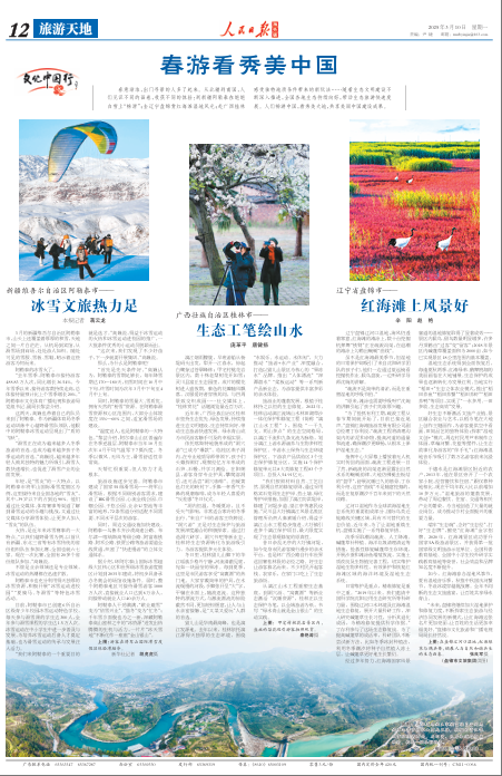 春意渐浓,出门寻景的人多了起来。从北疆到南国,人们见识不同的画卷,收获不同的体验:到新疆阿勒泰在皑皑白雪上“畅滑”;去辽宁盘锦赏红海滩湿地风光;赴广西桂林感受独特地质条件带来的新玩法……随着生态文明建设不断深入推进,全国各地生态持续向好,带动生态旅游快速发展。人们畅游中国,看秀美大地,共享美丽中国建设成果。