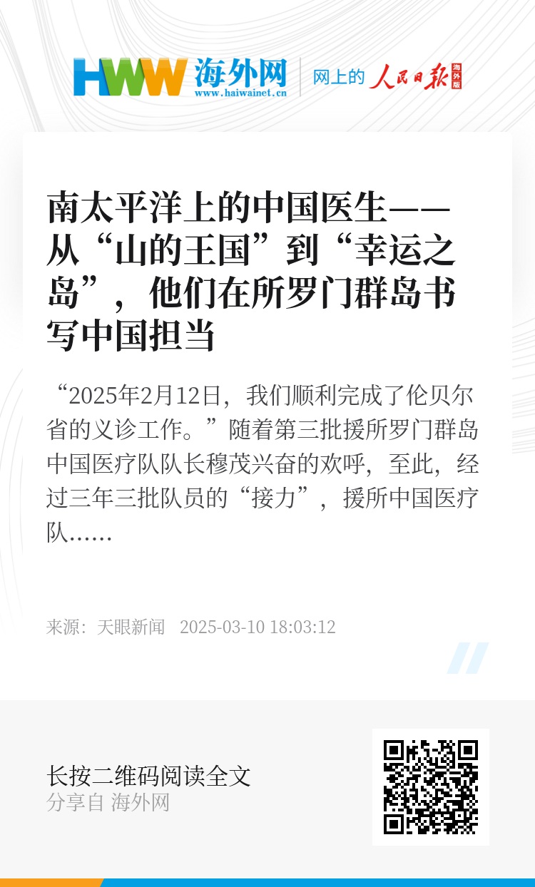 “2025年2月12日,我们顺利完成了伦贝尔省的义诊工作。”随着第三批援所罗门群岛中国医疗队队长穆茂兴奋的欢呼,至此,经过三年三批队员的“接力”,援所中国医疗队的足迹已遍布所罗门群岛全部9个省份。