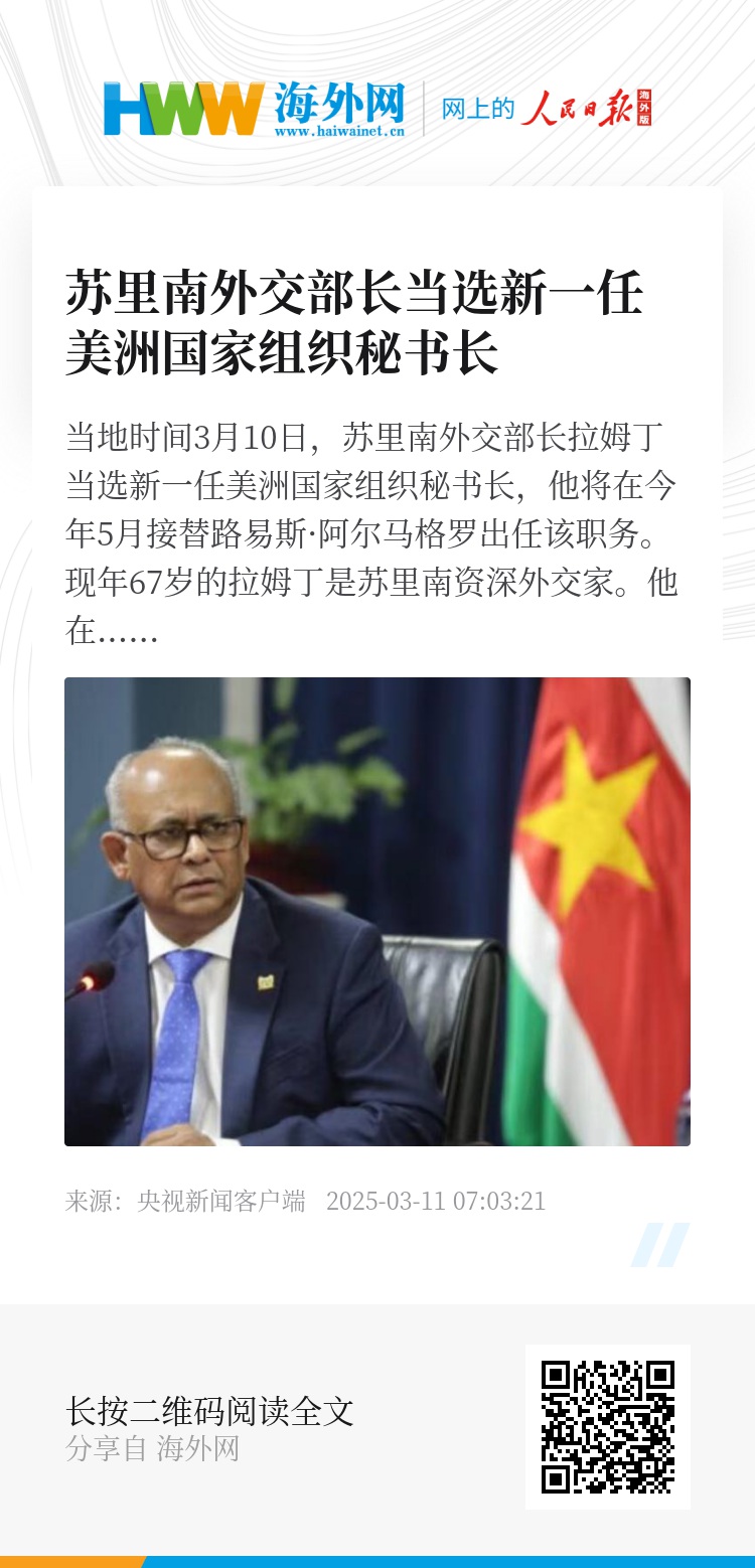 当地时间3月10日,苏里南外交部长拉姆丁当选新一任美洲国家组织秘书长,他将在今年5月接替路易斯·阿尔马格罗出任该职务。