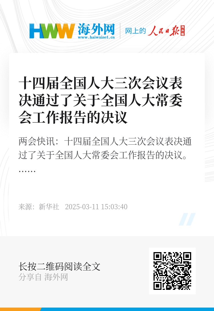 两会新华社快讯:十四届全国人大三次会议表决通过了关于全国人大常委会工作报告的决议。