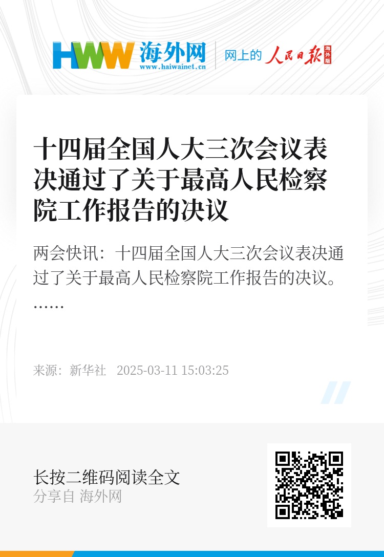 两会新华社快讯:十四届全国人大三次会议表决通过了关于最高人民检察院工作报告的决议。