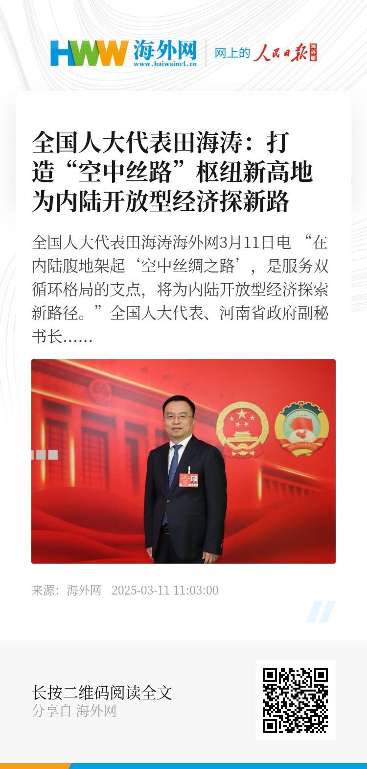 着眼建设“空中丝绸之路”,田海涛在两会上向国家部委提出四项建议:争取航权航线政策突破、创建国家物流枢纽示范区、推动综保区设立陆空双片区、将邮政航空枢纽纳入国家“十五五”规划。目前,航空港区已吸引177家外资企业落户中韩国际合作产业园,通过“万人助万企”机制持续优化营商环境。