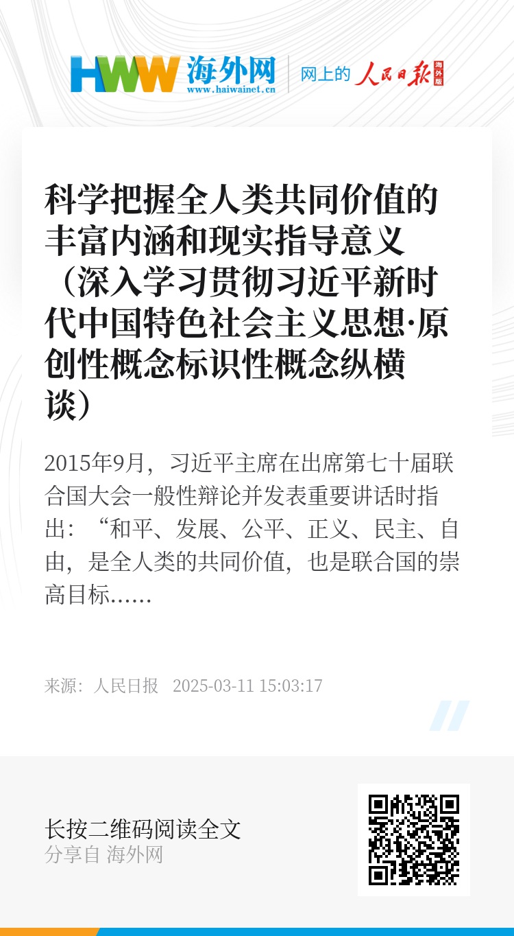 全人类共同价值从人类是命运与共的共同体出发,破解“普世价值”迷思,反映当今时代主流价值追求。在很长一段时间里,少数西方国家利用自己的优势地位,通过推行所谓“普世价值”将自己的价值观和模式强加于人,借此干涉他国内政。与西方所谓“普世价值”的虚伪性与排他性不同,全人类共同价值更具现实性和包容性,引导人们树立正确的价值观。和平、发展、公平、正义、民主、自由,彼此相互联系、相互促进、缺一不可。和平与发展是基础与前提,没有和平与发展,其他都谈不上。公平与正义作为国际关系的重要准则,受到霸权主义和强权政治的冲击,但人们追求公平正义的理想并没有改变,推动国际关系法治化、民主化的力量在不断增强,用少数国家制定的规则取代普遍接受的国际法则行不通。无论在国内层面,还是在国际层面,民主与自由都是现代政治文明的重要内容、是人们追求的目标,但其实现有多种方式,不可能千篇一律。全人类共同价值摒弃了非此即彼、非友即敌的思维方式,把人类作为一个命运共同体来考察,体现了胸怀天下的创新性、包容性和先进性。