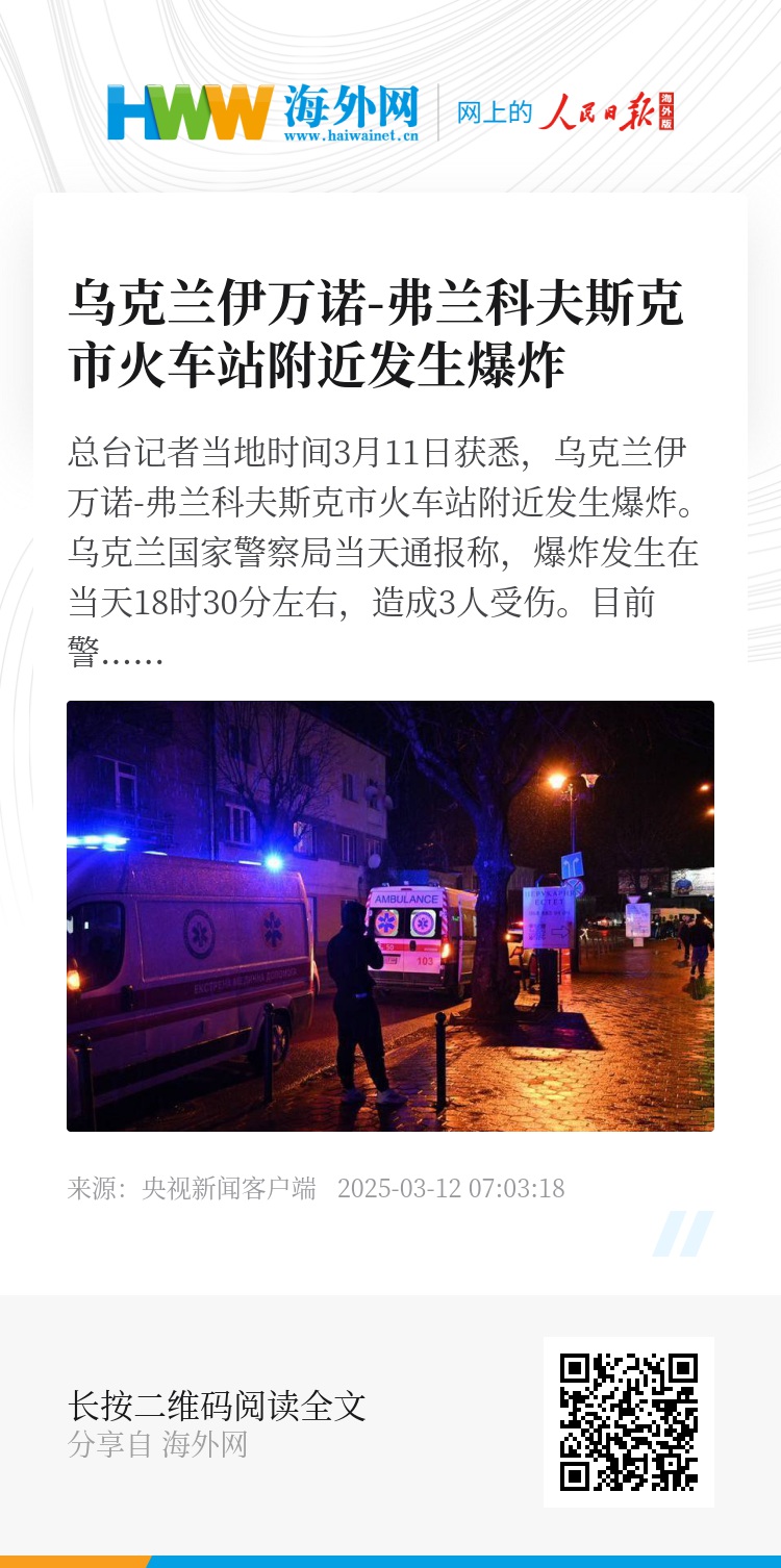 总台记者当地时间3月11日获悉,乌克兰伊万诺-弗兰科夫斯克市火车站附近发生爆炸。