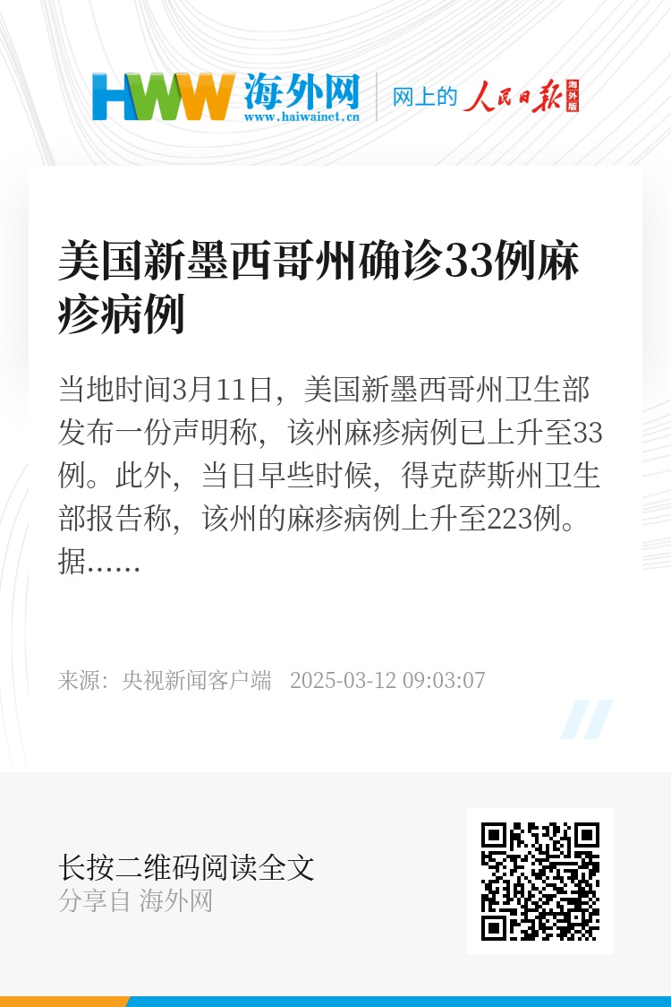 当地时间3月11日,美国新墨西哥州卫生部发布一份声明称,该州麻疹病例已上升至33例。此外,当日早些时候,得克萨斯州卫生部报告称,该州的麻疹病例上升至223例。