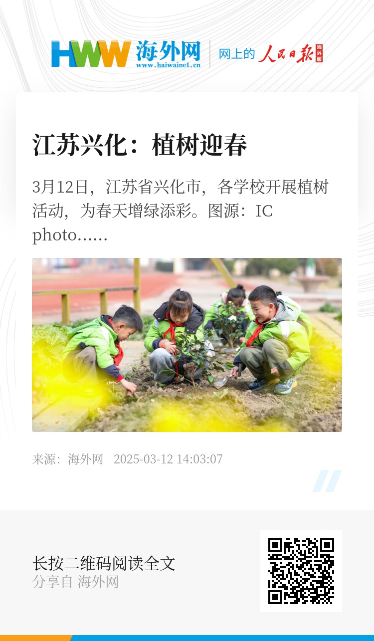 3月12日,江苏省兴化市,各学校开展植树活动,为春天增绿添彩。图源:IC photo