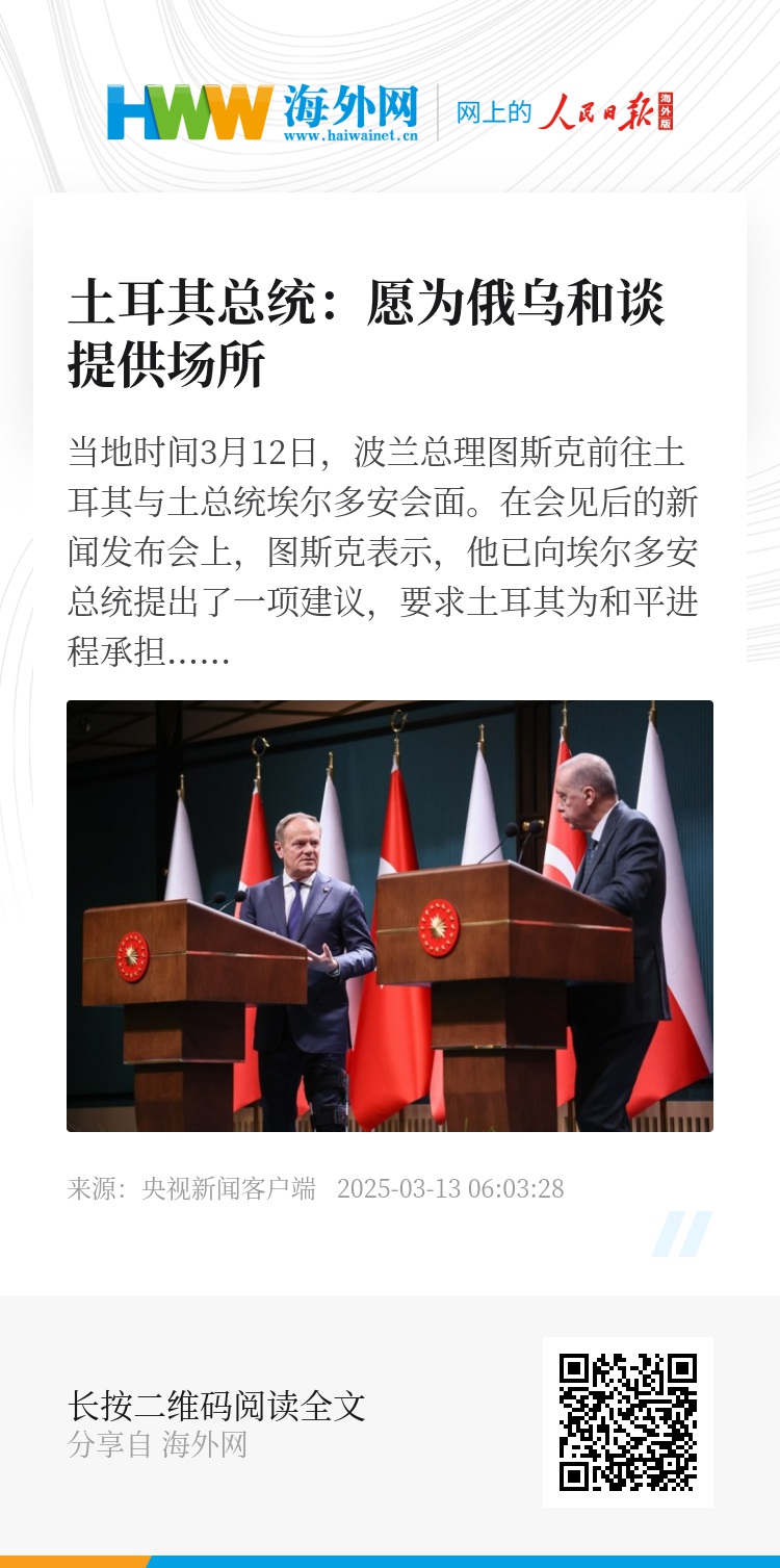 当地时间3月12日,波兰总理图斯克前往土耳其与土总统埃尔多安会面。在会见后的新闻发布会上,图斯克表示,他已向埃尔多安总统提出了一项建议,要求土耳其为和平进程承担最大程度的共同责任,保障整个地区的稳定与安全。