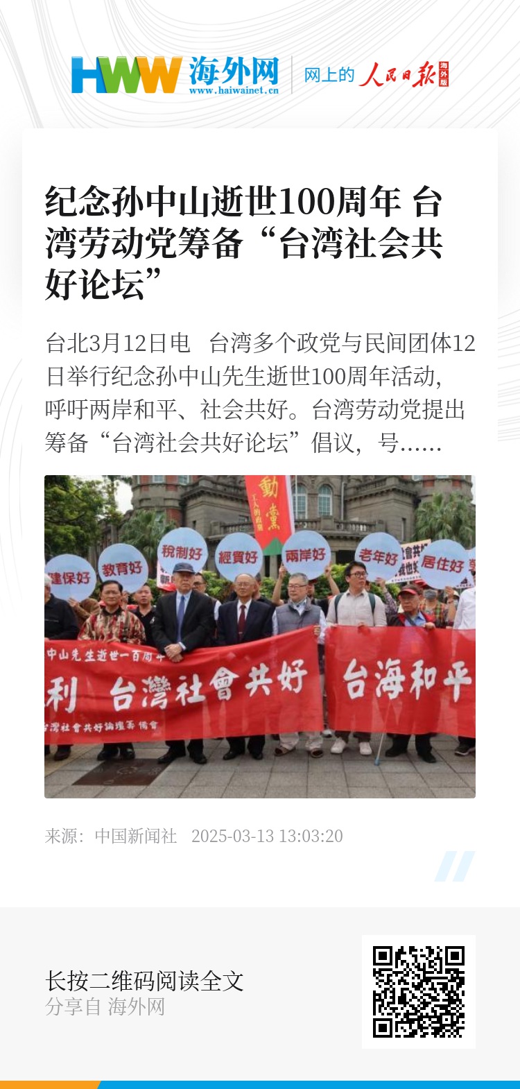中新网台北3月12日电 台湾多个政党与民间团体12日举行纪念孙中山先生逝世100周年活动,呼吁两岸和平、社会共好。台湾劳动党提出筹备“台湾社会共好论坛”倡议,号召台湾民众共同参与,推动社会改革。