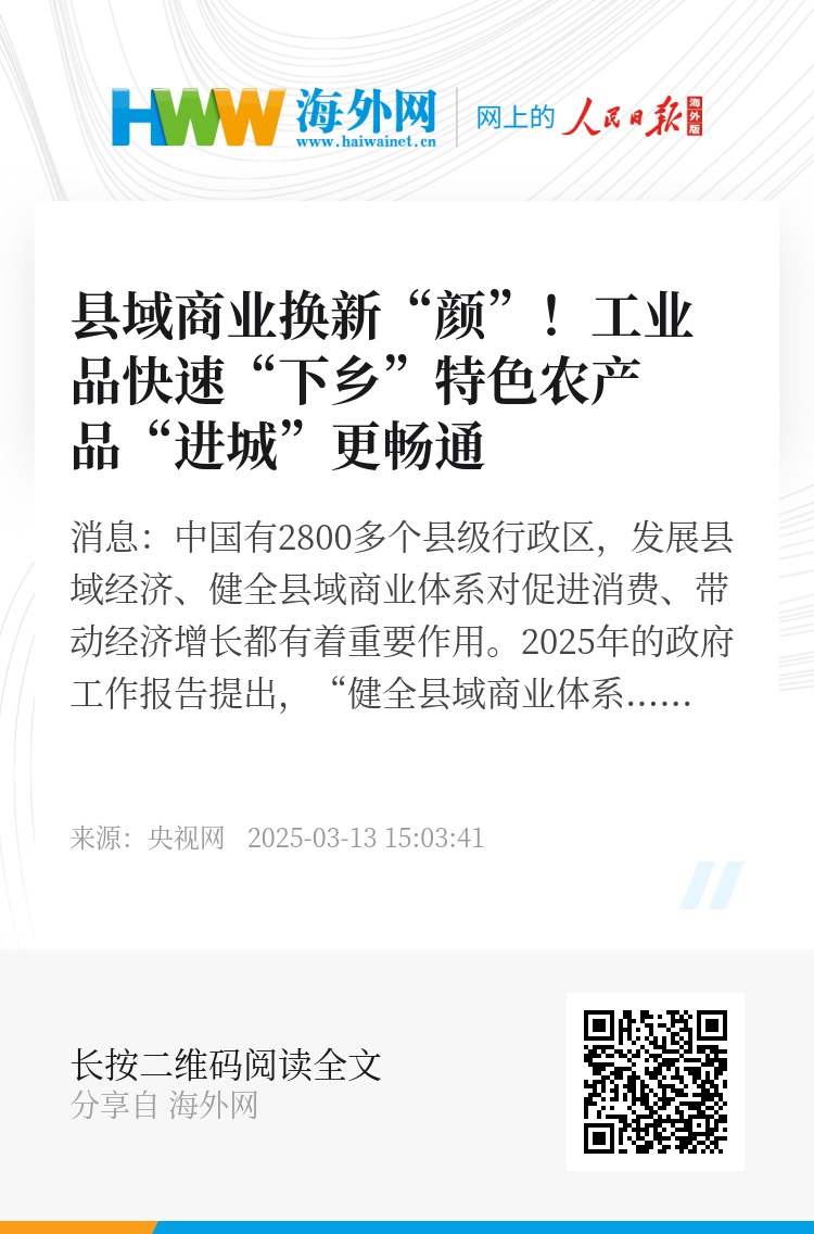 记者从商务部近日召开的县域商业体系建设工作协调机制会上了解到,2025年,国家将进一步完善县域商业网络,创新发展业态模式,实现农产品流通效能明显提升,物流配送效率持续提高,促进县域消费规模持续扩大。