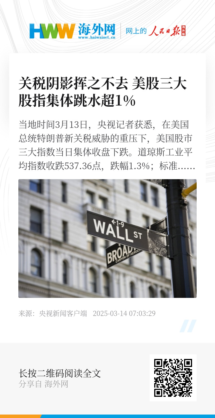 当地时间3月13日,央视记者获悉,在美国总统特朗普新关税威胁的重压下,美国股市三大指数当日集体收盘下跌。