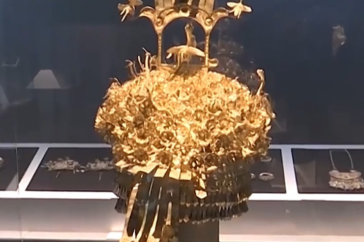 很多人可能都不知道,北京服装学院民族服饰博物馆是我国第一家服饰类专业博物馆,这里设有少数民族服饰厅、金工首饰厅、织锦刺绣蜡染厅等七个展厅,收藏着我国各民族的服装、饰品、织物、蜡染、刺绣等一万多件,也被称为民族服饰文化的基因库。在金工首饰厅,这件手工打造的苗族纯银凤冠让人眼前一亮。