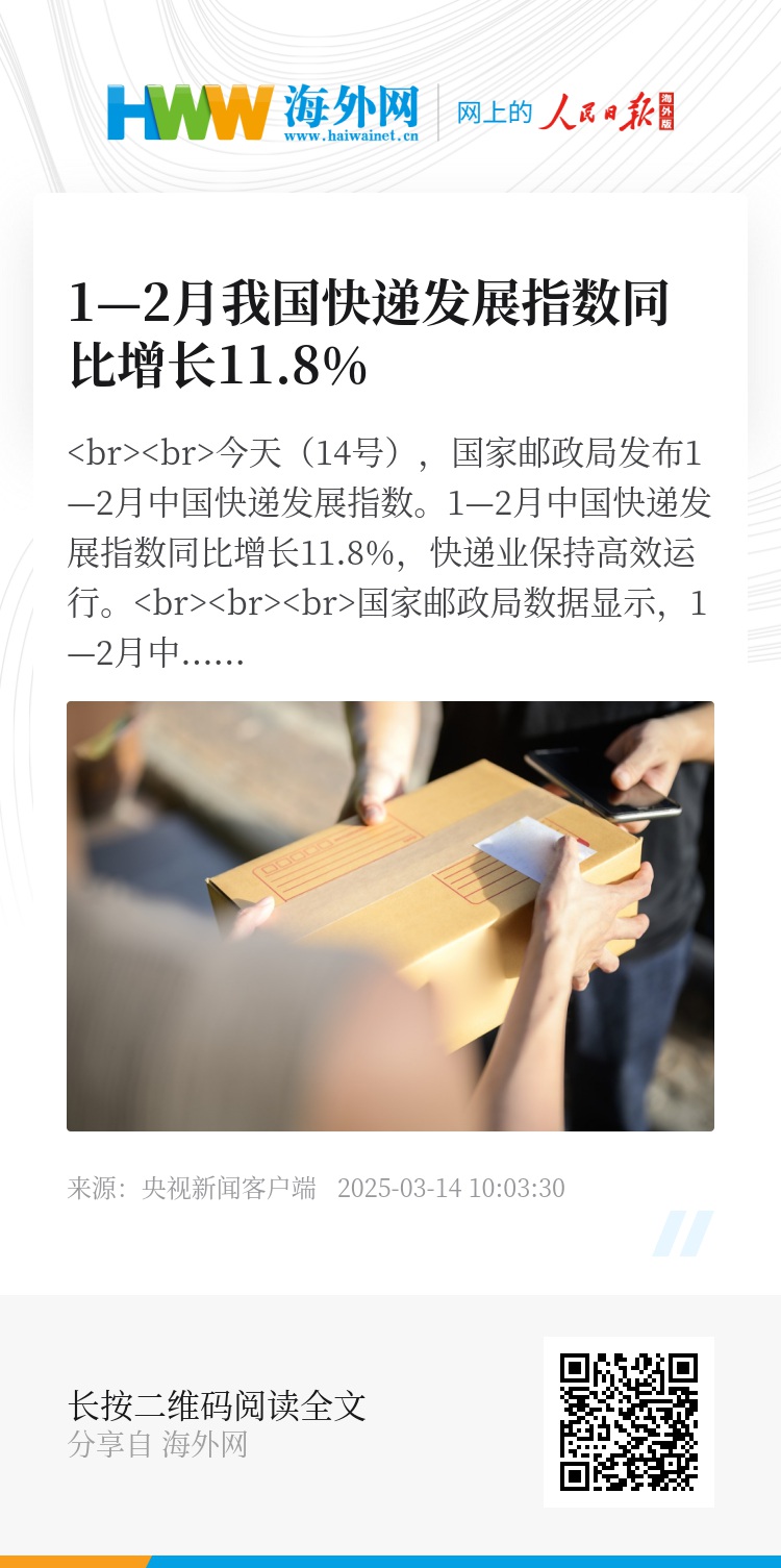 今天(14号),国家邮政局发布1—2月中国快递发展指数。1—2月中国快递发展指数同比增长11.8%,快递业保持高效运行。