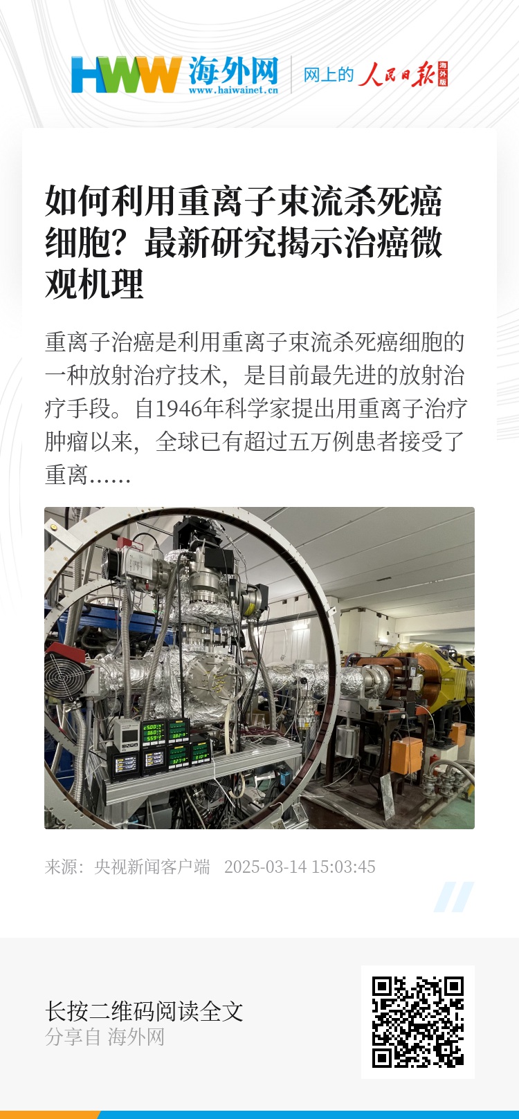 重离子治癌是利用重离子束流杀死癌细胞的一种放射治疗技术,是目前最先进的放射治疗手段。自1946年科学家提出用重离子治疗肿瘤以来,全球已有超过五万例患者接受了重离子治疗。