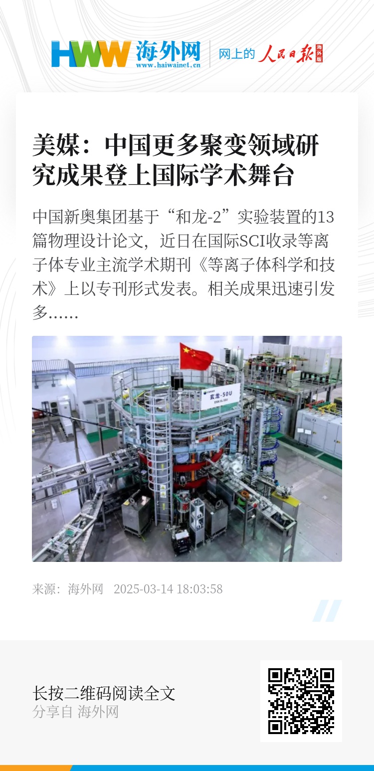 海外网3月14日电 中国新奥集团基于“和龙-2”实验装置的13篇物理设计论文,近日在国际SCI收录等离子体专业主流学术期刊《等离子体科学和技术》上以专刊形式发表。相关成果迅速引发多家外媒大篇幅报道,认为新奥集团在球形环氢硼聚变技术方面取得一系列重大突破。