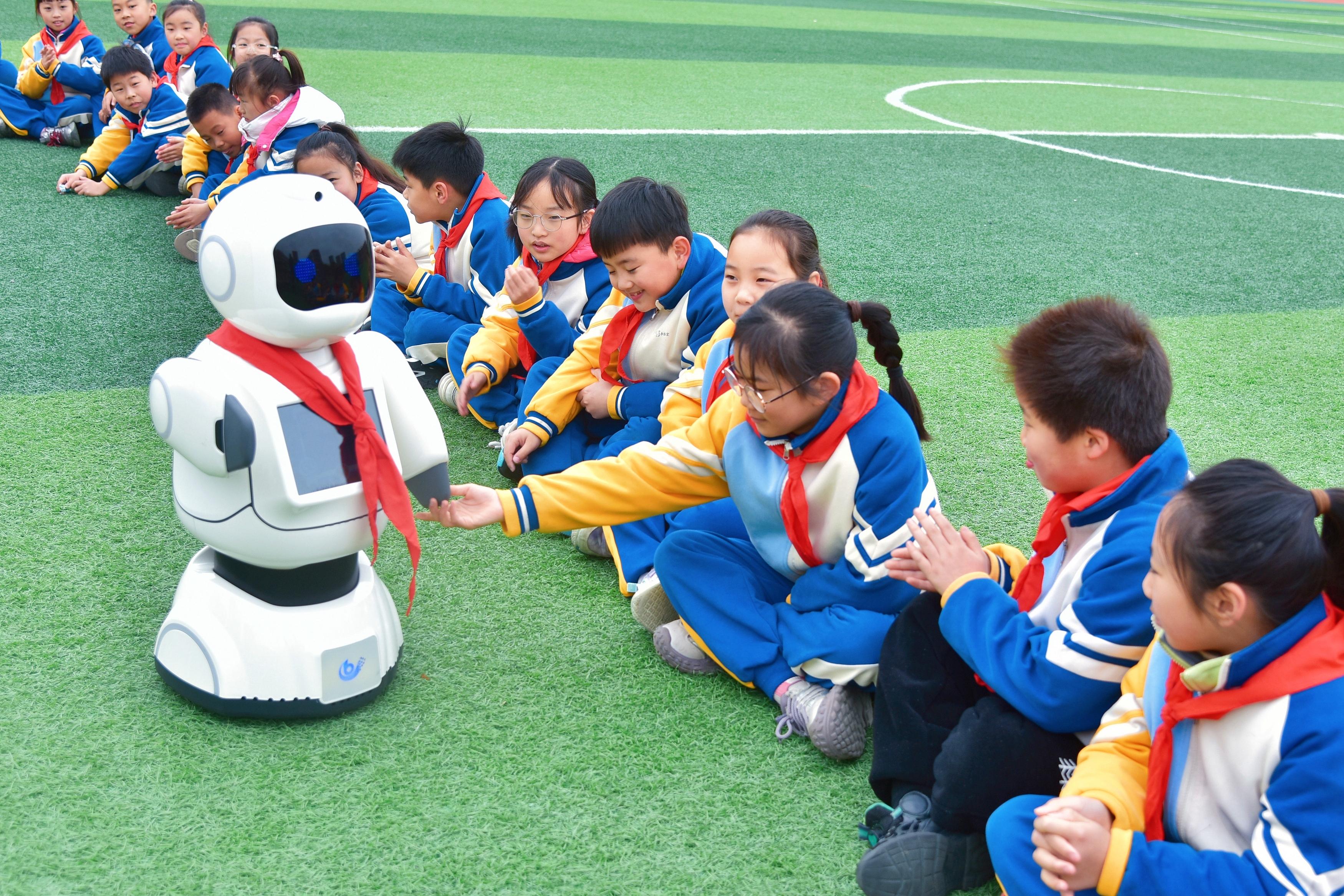 △2025年3月10日,江苏南通,如皋经济技术开发区实验小学课间,学生与智能机器人“宾果”互动。