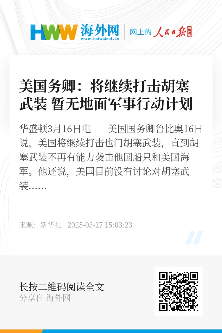 新华社华盛顿3月16日电 美国国务卿鲁比奥16日说,美国将继续打击也门胡塞武装,直到胡塞武装不再有能力袭击他国船只和美国海军。他还说,美国目前没有讨论对胡塞武装发起地面军事行动。