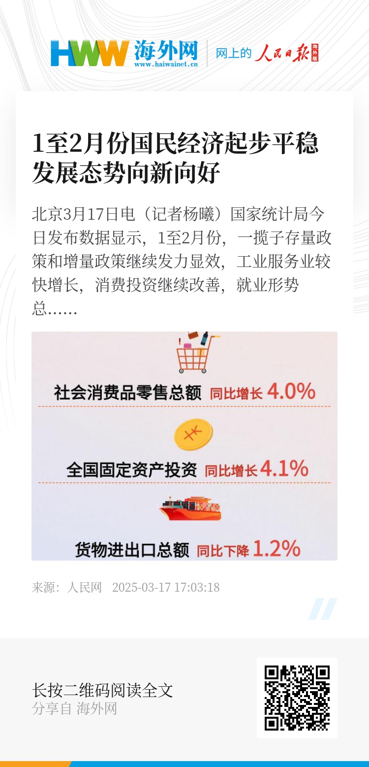 人民网北京3月17日电(记者杨曦)国家统计局今日发布数据显示,1至2月份,一揽子存量政策和增量政策继续发力显效,工业服务业较快增长,消费投资继续改善,就业形势总体稳定,新质生产力成长壮大,经济运行起步平稳,发展态势向新向好。