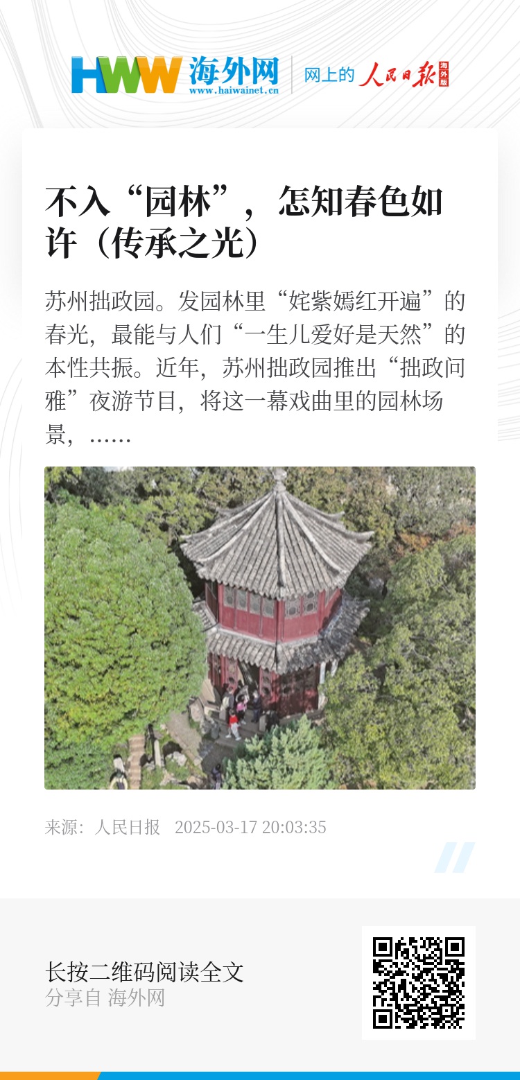 中国园林作为“活态遗产”,成为连接传统与现代、东方与西方的诗意纽带。当前,AI技术的普及应用,又为传统园林的活化利用开拓出更大的空间。中国古典园林,将迎来更加明媚的春天!(刘珊珊)