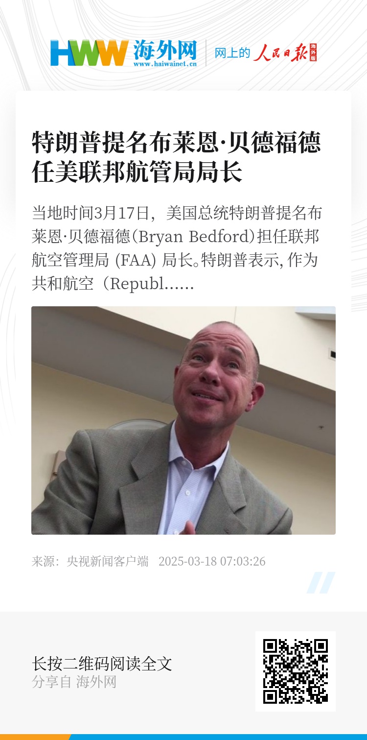 特朗普表示,作为共和航空(Republic Airways)、美莎芭航空(Mesaba Airlines)和商务快运航空(Business Express Airlines)的前总裁和首席执行官,贝德福德有30多年的航空和行政领导经验。特朗普称,贝德福德将与美国交通部长肖恩·达菲合作,大力改革该机构,并确保每年近10亿人次的客运安全。(央视记者 许骁)