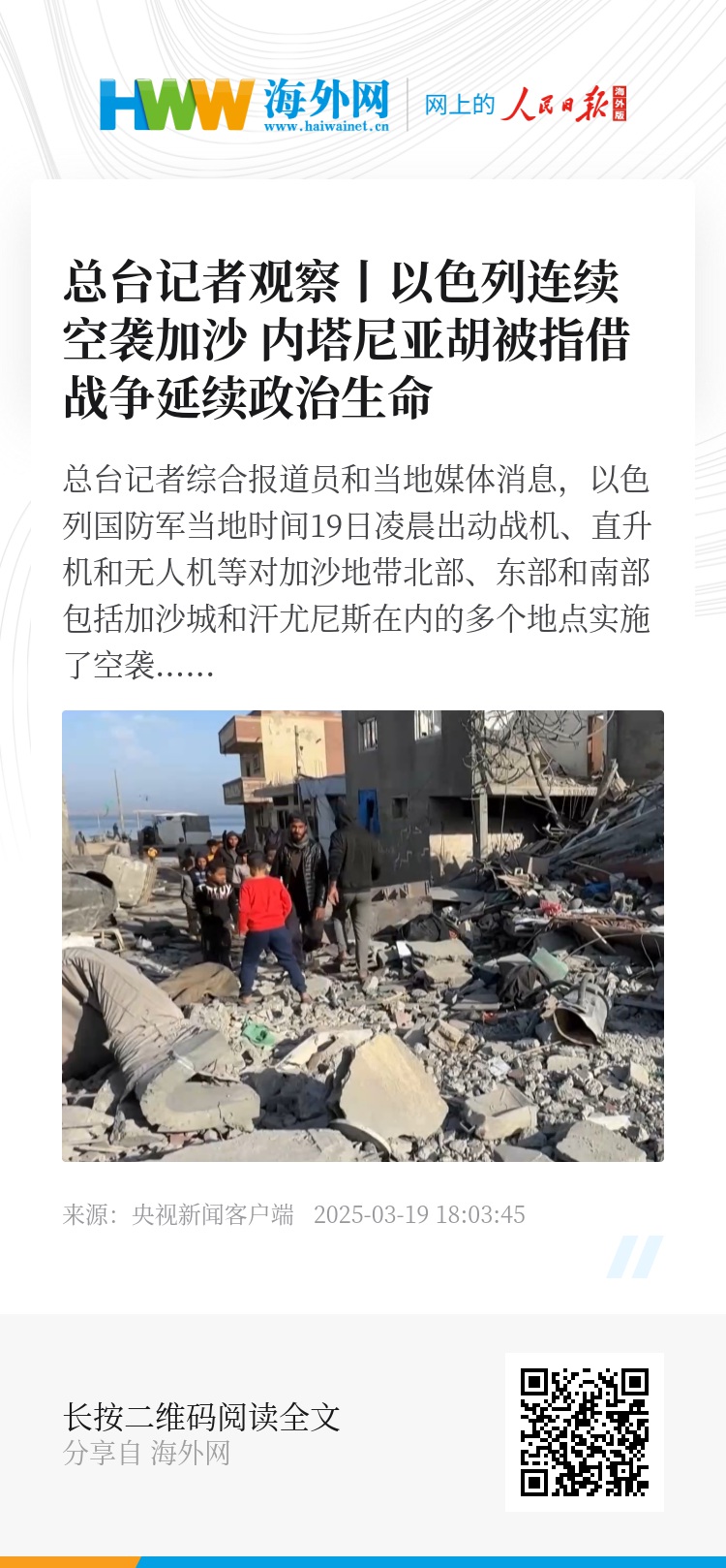 总台记者 梁慧:对此,以色列《国土报》用“内塔尼亚胡的真正目的是通过无休止的战争延续其政治生命”为题评论称,内塔尼亚胡政府重启战争的目的,是为了让前国家安全部长本-格维尔领导的犹太力量党重返执政联盟。值得注意的是,18日以色列总理办公室发表声明,宣布恢复本-格维尔的国家安全部长职务。当地媒体评论称,随着本-格维尔领导的犹太力量党重返内塔尼亚胡的执政联盟,以政府对停火谈判和战时态度的立场可能会更加强硬。