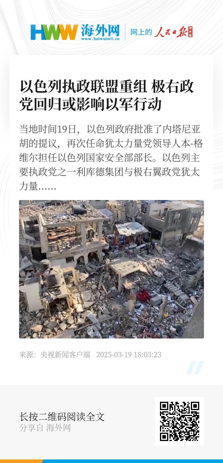 当地时间19日,以色列政府批准了内塔尼亚胡的提议,再次任命犹太力量党领导人本-格维尔担任以色列国家安全部部长。以色列主要执政党之一利库德集团与极右翼政党犹太力量党18日下午发表联合声明,称双方已达成协议,犹太力量党将重返由现任总理内塔尼亚胡领导的执政联盟,而隶属于犹太力量党的部长们也将重返内阁。分析人士认为,以色列政坛的分分合合与以色列恢复对加沙军事行动之间存在一定联系。