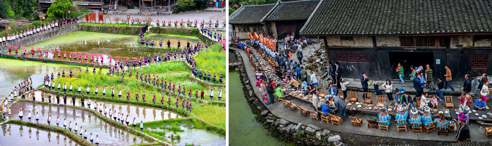 左图:近期,人们在黎平县肇兴侗寨的田园里演唱侗族大歌(黎平县委宣传部供图);右图:这是2023年拍摄的十八洞村长桌宴(湘西州委宣传部供图)。