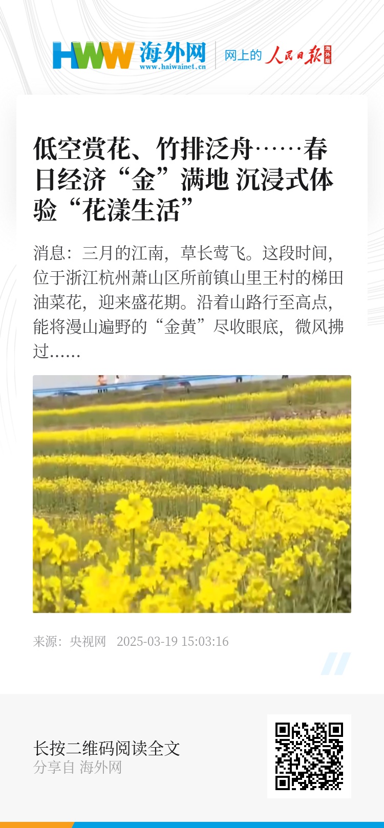 央视网消息:三月的江南,草长莺飞。这段时间,位于浙江杭州萧山区所前镇山里王村的梯田油菜花,迎来盛花期。沿着山路行至高点,能将漫山遍野的“金黄”尽收眼底,微风拂过,整片山野仿佛被注入了灵动的生命力,空气中弥漫着春天的气息。