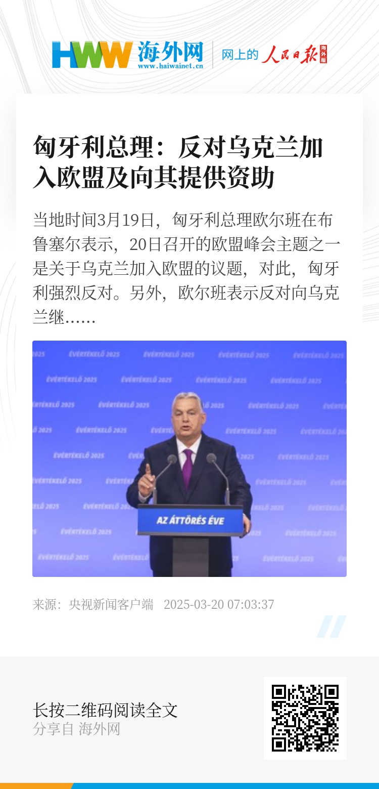 当地时间3月19日,匈牙利总理欧尔班在布鲁塞尔表示,20日召开的欧盟峰会主题之一是关于乌克兰加入欧盟的议题,对此,匈牙利强烈反对。