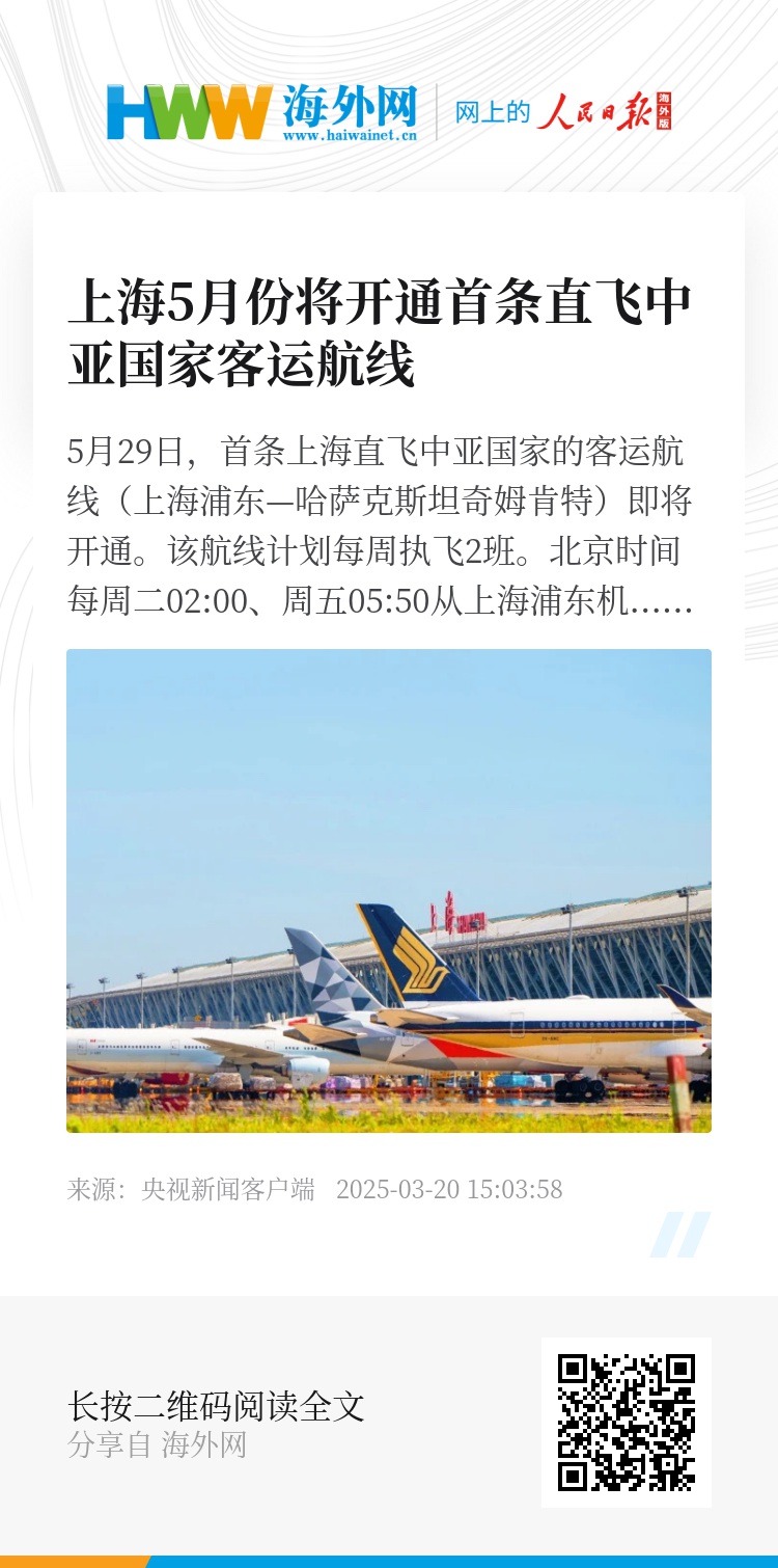 5月29日,首条上海直飞中亚国家的客运航线(上海浦东—哈萨克斯坦奇姆肯特)即将开通。
