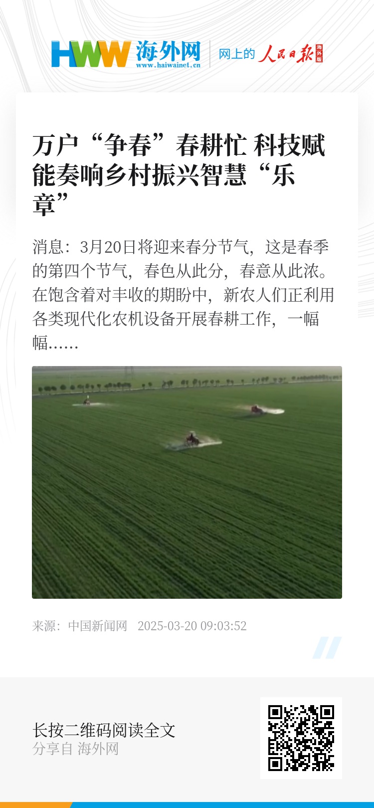央视网消息:3月20日将迎来春分节气,这是春季的第四个节气,春色从此分,春意从此浓。在饱含着对丰收的期盼中,新农人们正利用各类现代化农机设备开展春耕工作,一幅幅万户“争春”的新画卷从南到北徐徐展开。