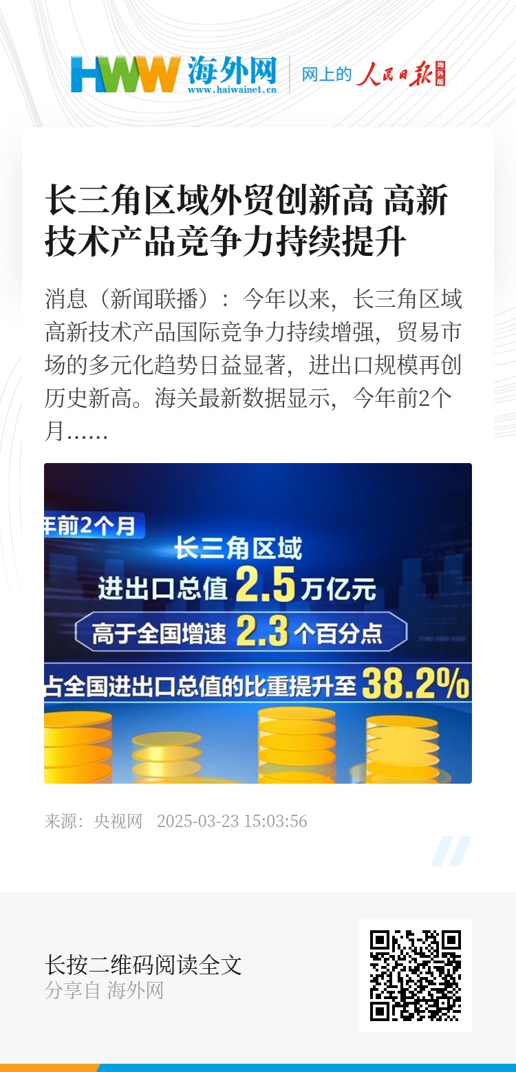 央视网消息(新闻联播):今年以来,长三角区域高新技术产品国际竞争力持续增强,贸易市场的多元化趋势日益显著,进出口规模再创历史新高。
