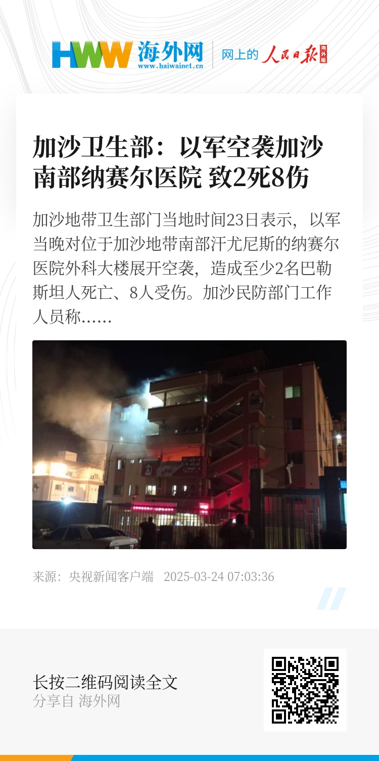 加沙地带卫生部门当地时间23日表示,以军当晚对位于加沙地带南部汗尤尼斯的纳赛尔医院外科大楼展开空袭,造成至少2名巴勒斯坦人死亡、8人受伤。
