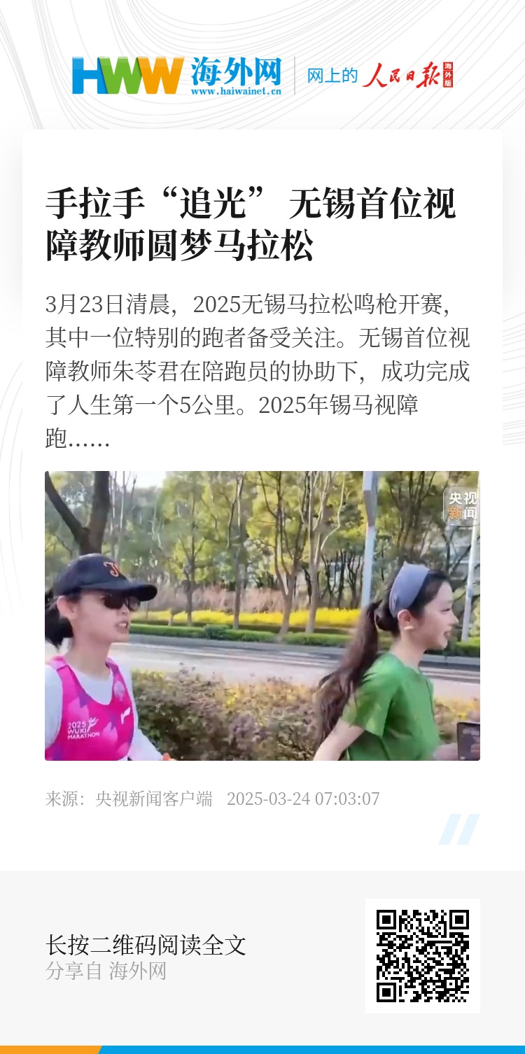 3月23日清晨,2025无锡马拉松鸣枪开赛,其中一位特别的跑者备受关注。无锡首位视障教师朱苓君在陪跑员的协助下,成功完成了人生第一个5公里。