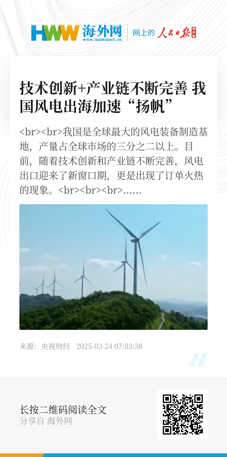 我国是全球最大的风电装备制造基地,产量占全球市场的三分之二以上。目前,随着技术创新和产业链不断完善,风电出口迎来了新窗口期,更是出现了订单火热的现象。