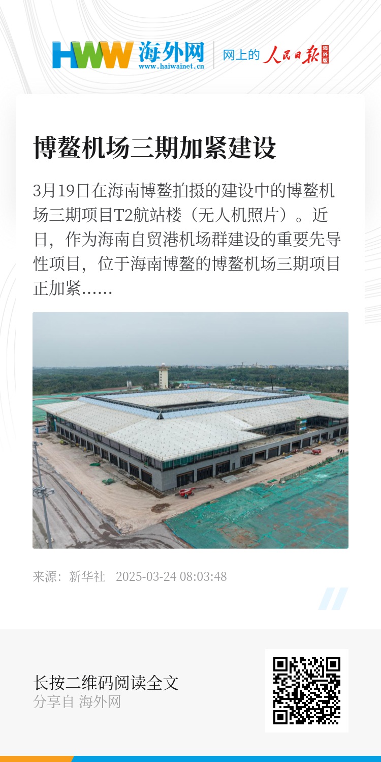 近日,作为海南自贸港机场群建设的重要先导性项目,位于海南博鳌的博鳌机场三期项目正加紧施工。该项目主要建设3.4万平方米的T2航站楼、11万平方米的停机坪及相关配套工程。项目建成投用后,博鳌机场将满足年旅客吞吐量300万人次的保障需求,更好地服务博鳌亚洲论坛年会,助力海南东部区域经济社会高质量发展。