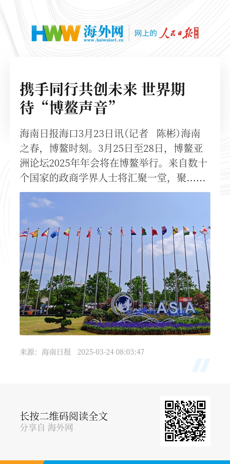 海南日报海口3月23日讯(记者 陈彬)海南之春,博鳌时刻。3月25日至28日,博鳌亚洲论坛2025年年会将在博鳌举行。来自数十个国家的政商学界人士将汇聚一堂,聚焦“在世界变局中共创亚洲未来”大会主题,激荡思想碰撞、提供解决方案,为亚洲和世界的发展贡献“博鳌智慧”。
