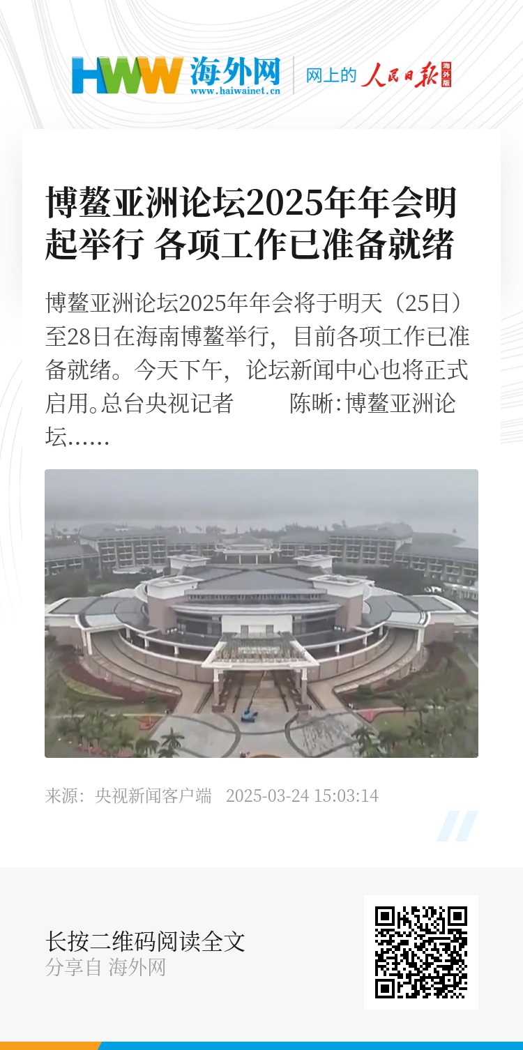 博鳌亚洲论坛2025年年会将于明天(25日)至28日在海南博鳌举行,目前各项工作已准备就绪。今天下午,论坛新闻中心也将正式启用。
