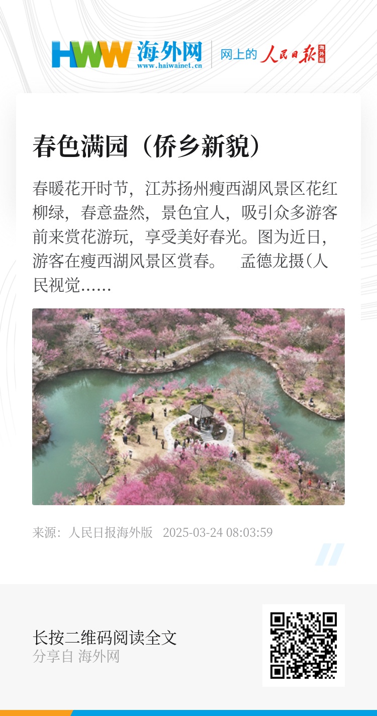春暖花开时节,江苏扬州瘦西湖风景区花红柳绿,春意盎然,景色宜人,吸引众多游客前来赏花游玩,享受美好春光。