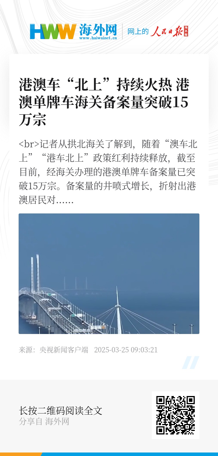 记者从拱北海关了解到,随着“澳车北上”“港车北上”政策红利持续释放,截至目前,经海关办理的港澳单牌车备案量已突破15万宗。备案量的井喷式增长,折射出港澳居民对大湾区便捷出行的迫切需求。