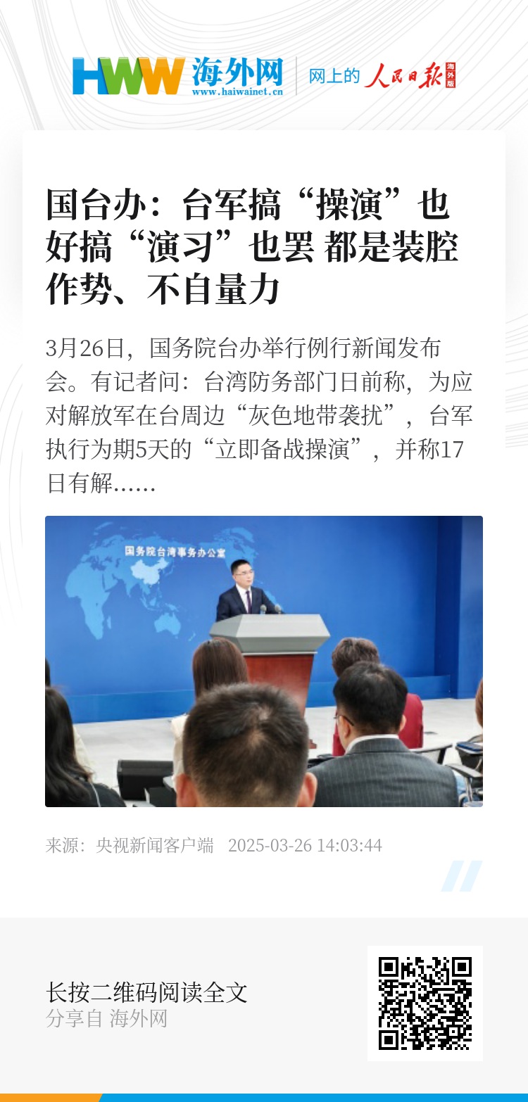 3月26日,国务院台办举行例行新闻发布会。有记者问:台湾防务部门日前称,为应对解放军在台周边“灰色地带袭扰”,台军执行为期5天的“立即备战操演”,并称17日有解放军军机数十架次跨越“海峡中线”进入台湾空域,配合军舰执行“联合战备警巡”。对此有何回应?