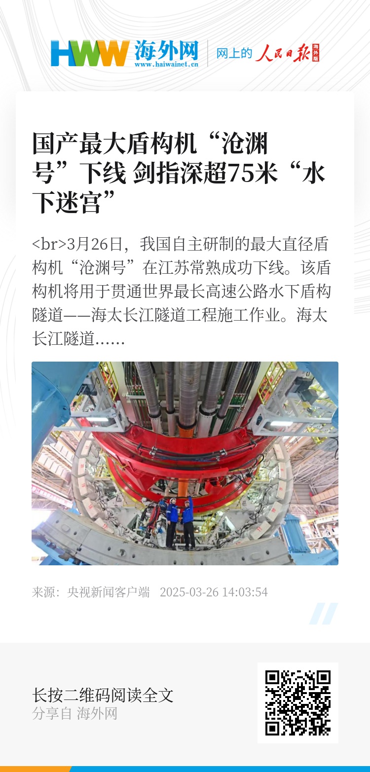 3月26日,我国自主研制的最大直径盾构机“沧渊号”在江苏常熟成功下线。该盾构机将用于贯通世界最长高速公路水下盾构隧道——海太长江隧道工程施工作业。