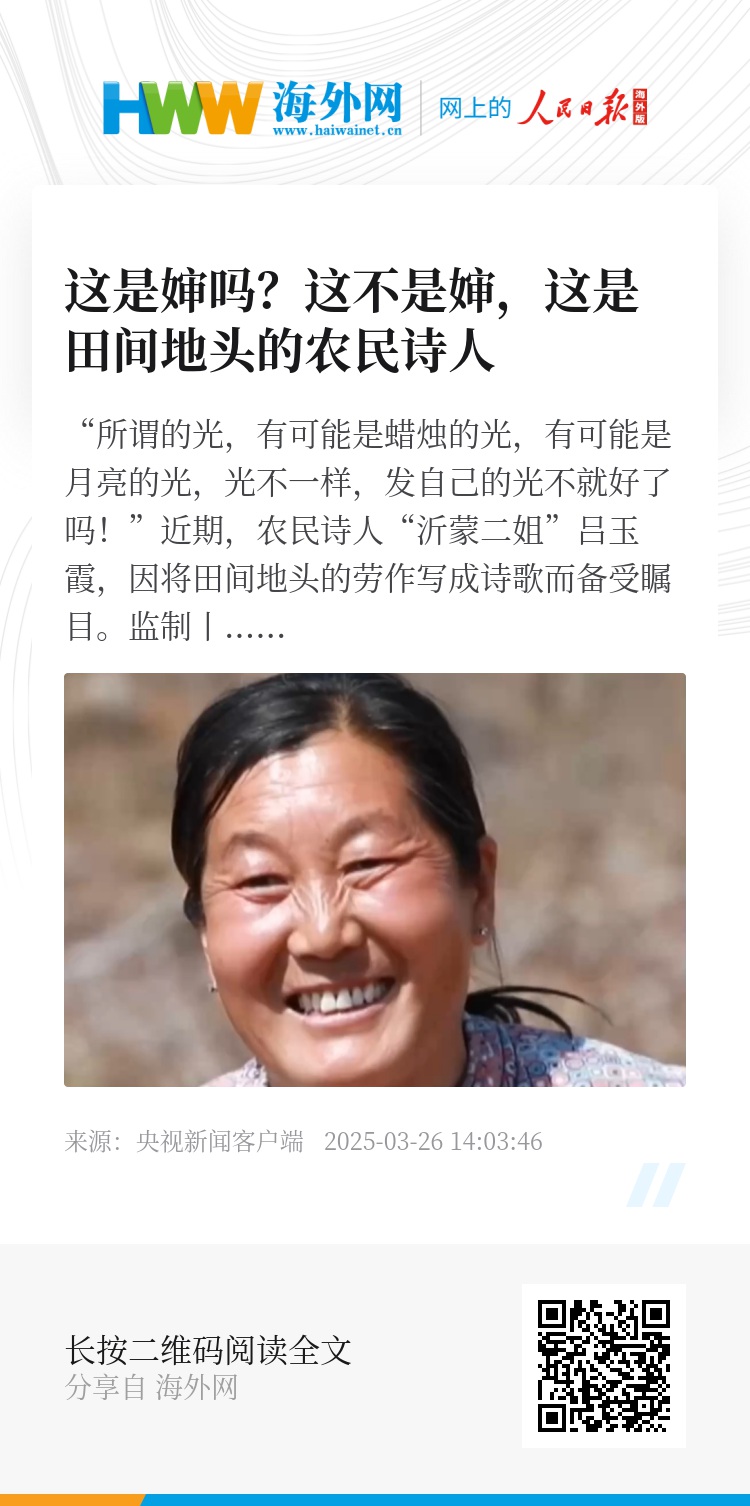 “所谓的光,有可能是蜡烛的光,有可能是月亮的光,光不一样,发自己的光不就好了吗!”近期,农民诗人“沂蒙二姐”吕玉霞,因将田间地头的劳作写成诗歌而备受瞩目。