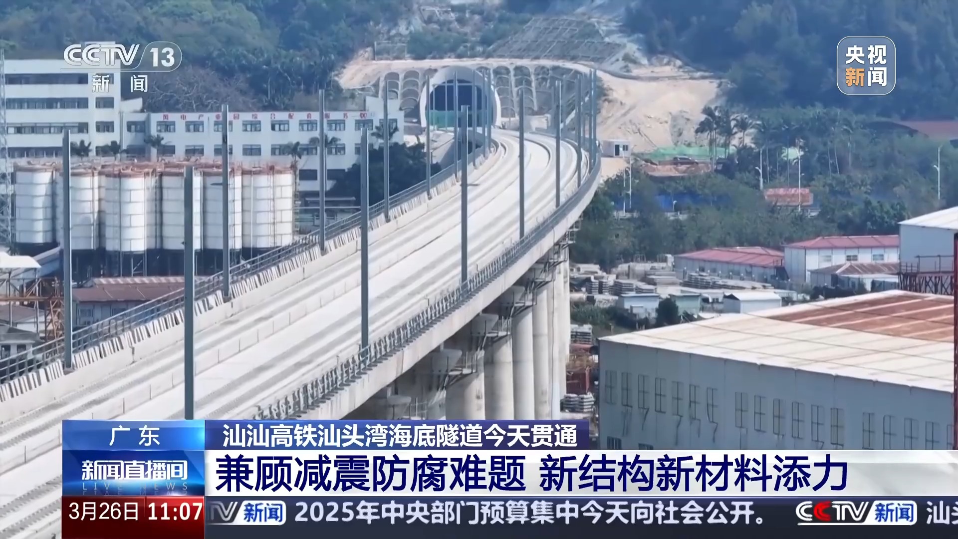 总台记者 吴媚苗:从空中看,全长9781米的隧道穿越的是碧蓝的汕头湾海域。盾构机的直径达到14.57米,相当于5层楼左右的高度,这也是目前我国高铁海底隧道中应用的最大直径盾构机。