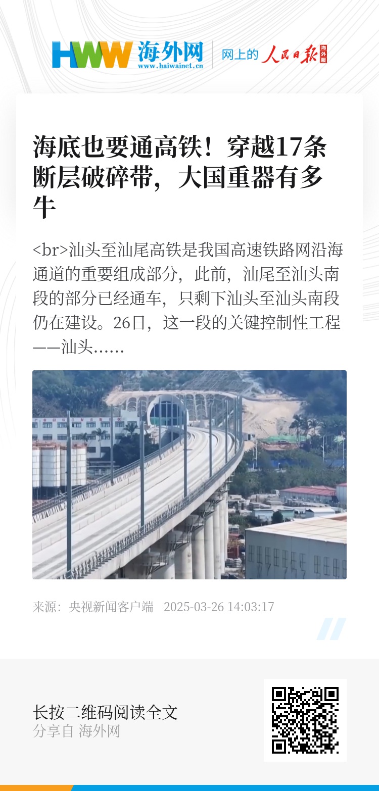 汕头至汕尾高铁是我国高速铁路网沿海通道的重要组成部分,此前,汕尾至汕头南段的部分已经通车,只剩下汕头至汕头南段仍在建设。26日,这一段的关键控制性工程——汕头湾海底隧道成功贯通,这也是我国首座设计时速350公里、单洞双线的高铁海底隧道。