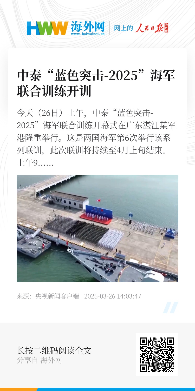 今天(26日)上午,中泰“蓝色突击-2025”海军联合训练开幕式在广东湛江某军港隆重举行。这是两国海军第6次举行该系列联训,此次联训将持续至4月上旬结束。