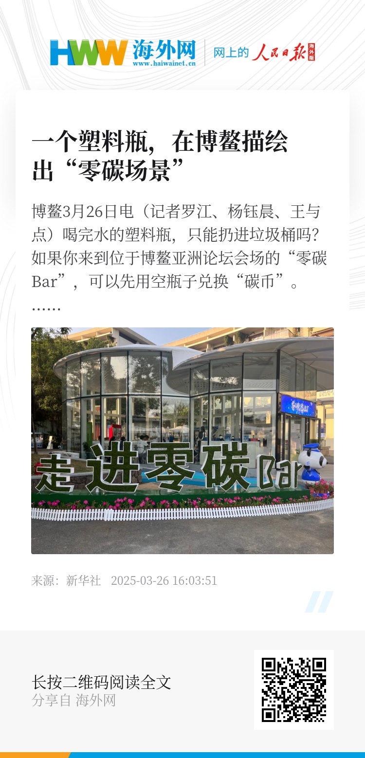 新华社博鳌3月26日电(记者罗江、杨钰晨、王与点)喝完水的塑料瓶,只能扔进垃圾桶吗?如果你来到位于博鳌亚洲论坛会场的“零碳Bar”,可以先用空瓶子兑换“碳币”。点上几款点心,再来杯“低碳咖啡”:选用海南优质咖啡豆,减少长途运输造成的碳排放;利用阳光自然烘焙,最大程度避免水质污染和电量消耗;选用“零碳牛奶”、海南特色植物基底搭配。